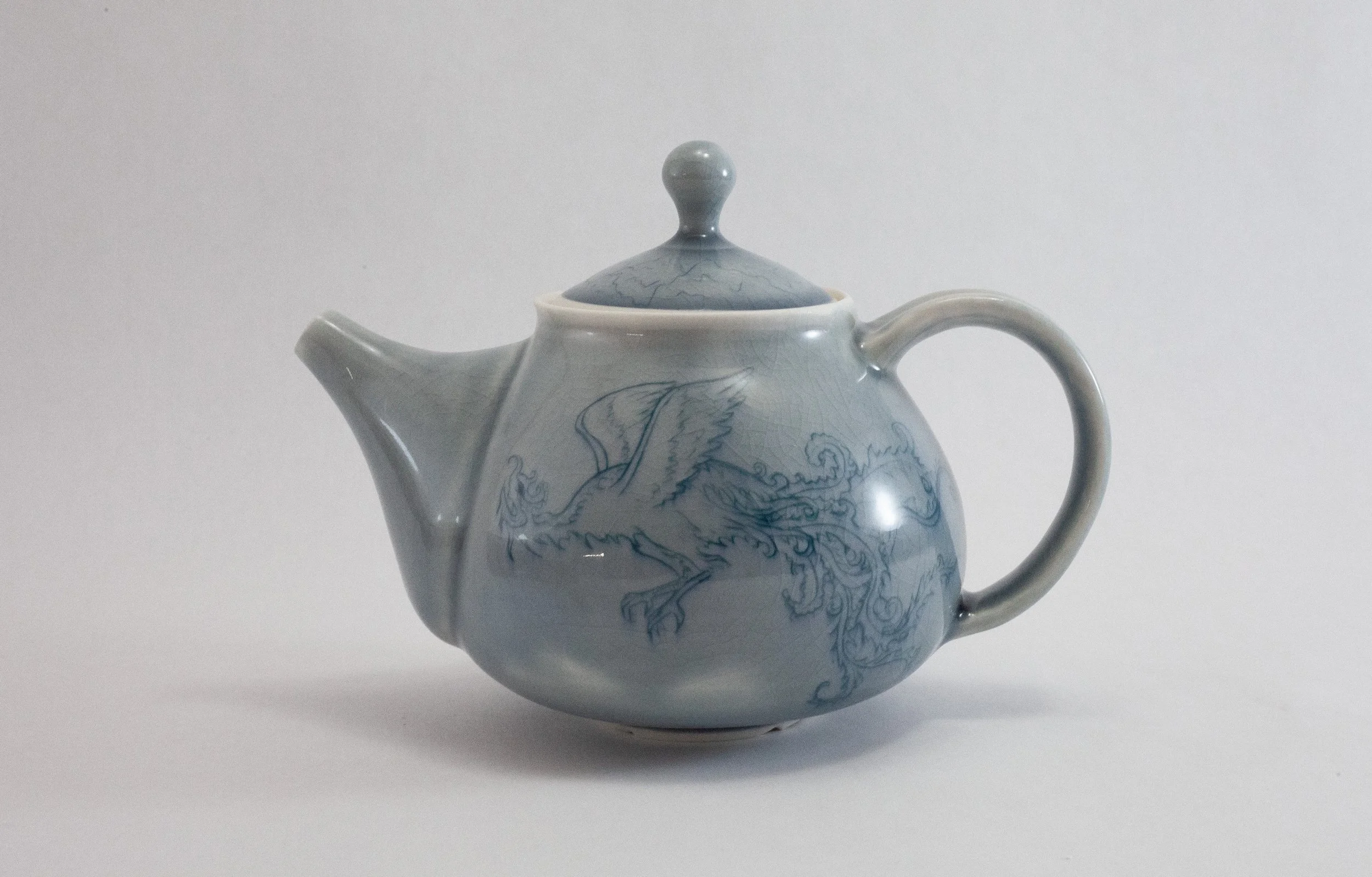 Simurgh (2024) is a porcelain tea set carved with imagery from an old Persian fable, The Conference of the Birds. In the story, a flock of birds go on a quest in search of a mystical bird to lead them, the Simurgh. By retelling this story on a teapot, Iām creating a vessel that fits into the traditions of tea-drinking and story-telling that I grew up with.